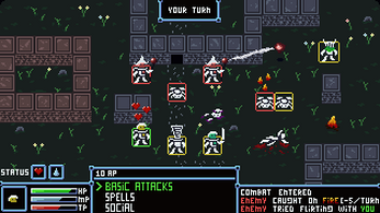 "Masquerade Knights" is a turn based strategy RPG, where the combat (fighting, spells, etc. ) and social (talking to NPCs, factions, moral choices) mechanics are combined into one "action" phase, where you can battle or talk with your enemies.